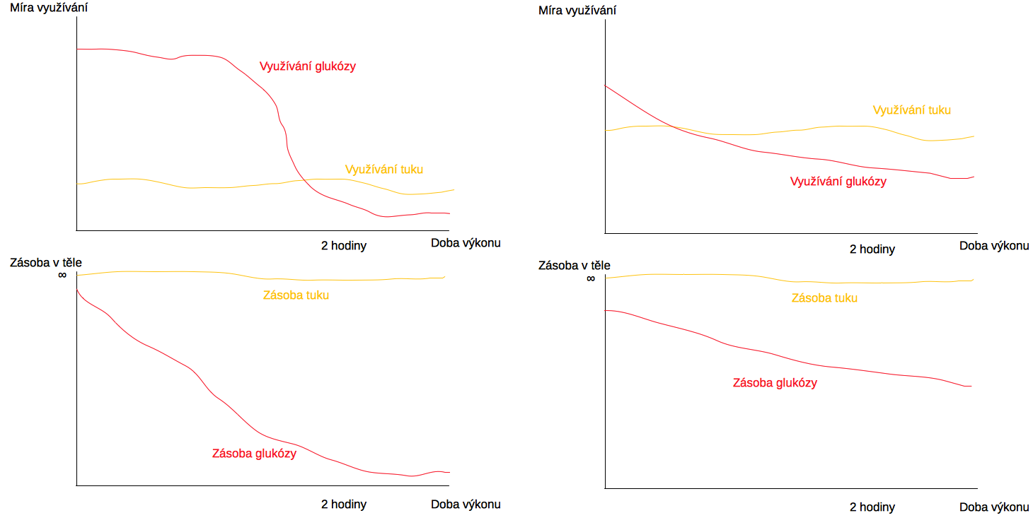 Na následujících grafech je nalevo situace energetických zásob při výkonu bez nektaru, napravo průběh s nektarem.